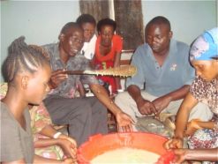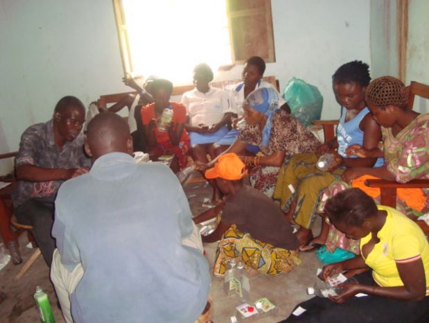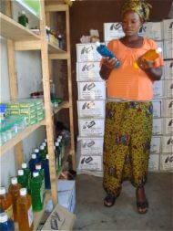 The very vibrant production department of the women group is seen here at work. Here they are placing labels on the plastic containers ready to package various liquid detergents which they have just made. Andrew and Pastor Ernest have formula of several products which are fully explained in our product page. Here Andrew is training women on how to package after having trained them in the manufacturing of the detergent. Bernadette is the Chairlady of the women department mandated with the day to day running of the IGA. The two ladies in school uniform are in our school sponsorship program with a purpose of helping Bernadette to administrate the production department as all the rest in the department are not educated.